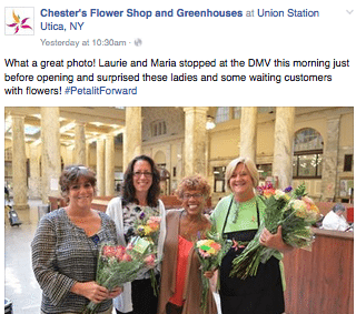 - Lorrie Anderson, of Country Florist in Waldorf, Maryland, took to civic groups to spread her message and share her flowers. She handed out 75 bouquets Tuesday morning to a weekly network meeting and then 50 additional bouquets later in the day at a Chamber of Commerce meeting. She extended the giveaway through Friday at her store — to the obvious delight of her customers. “People truly enjoyed getting the flowers,” she said. Grateful recipients, like the woman in this post who detailed how much the flowers from Chester’s Flower Shop & Greenhouses meant to her, were a common theme among participants in the Petal It Forward effort.