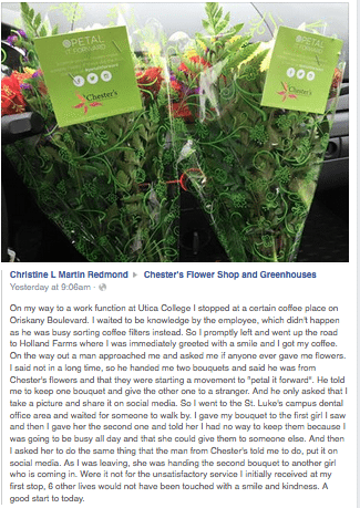 - The effort through Chester’s Flower Shop & Greenhouses helped turn around one woman’s day. After receiving subpar service at a local coffee shop, she was given two bouquets from a Chester’s employee. The flowers symbolized “a smile and kindness,” she wrote in a Facebook post.