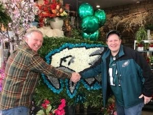 “We gave everyone that came in a free raffle ticket for a chance to win the Eagles tribute just in time for the big game, as well as, a free carnation, tipped Eagles green,” said Jennifer Kelly. The winner happened to be a customer who recently booked his wedding at the shop. “He just barely fit the tribute in his car trunk when he came back to pick it up and told us that he was going to display it proudly on his front lawn for everyone to see!”