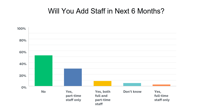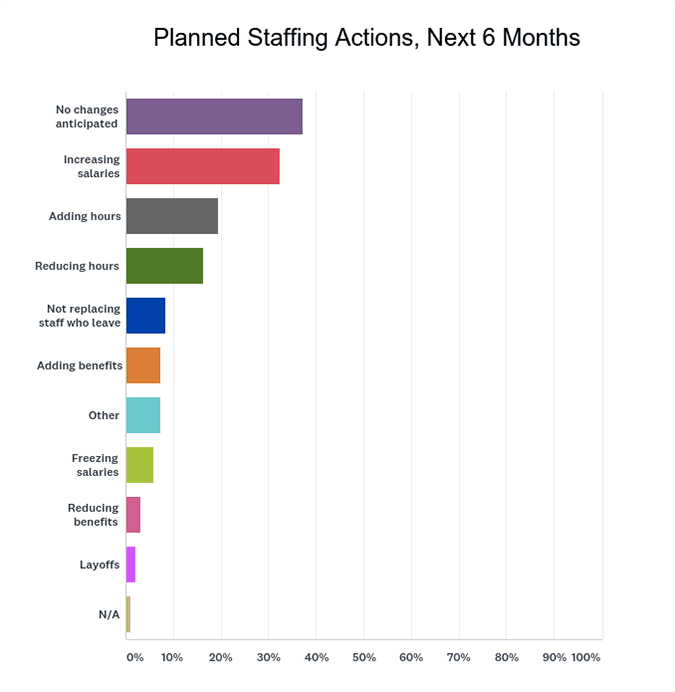 That increased spending isn’t necessarily going to be directed at new hires: 53 percent of respondents to the SAF survey said they do not plan to add any new staff in the next six months. About 30 percent plan to hire part-time staff only. Roughly 32 percent said they plan to increase salaries or pay within the next six months — 19 percent said they’ll add hours during that same time period. (About 16 percent plan to reduce hours.)