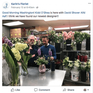 Karin’s Florist in Vienna, Virginia, appeared on Washington, D.C. news throughout the day on February 14. President Maris Angolia, AAF, sent various contacts press releases and practiced talking points with SAF Vice President of Marketing Jennifer Sparks.