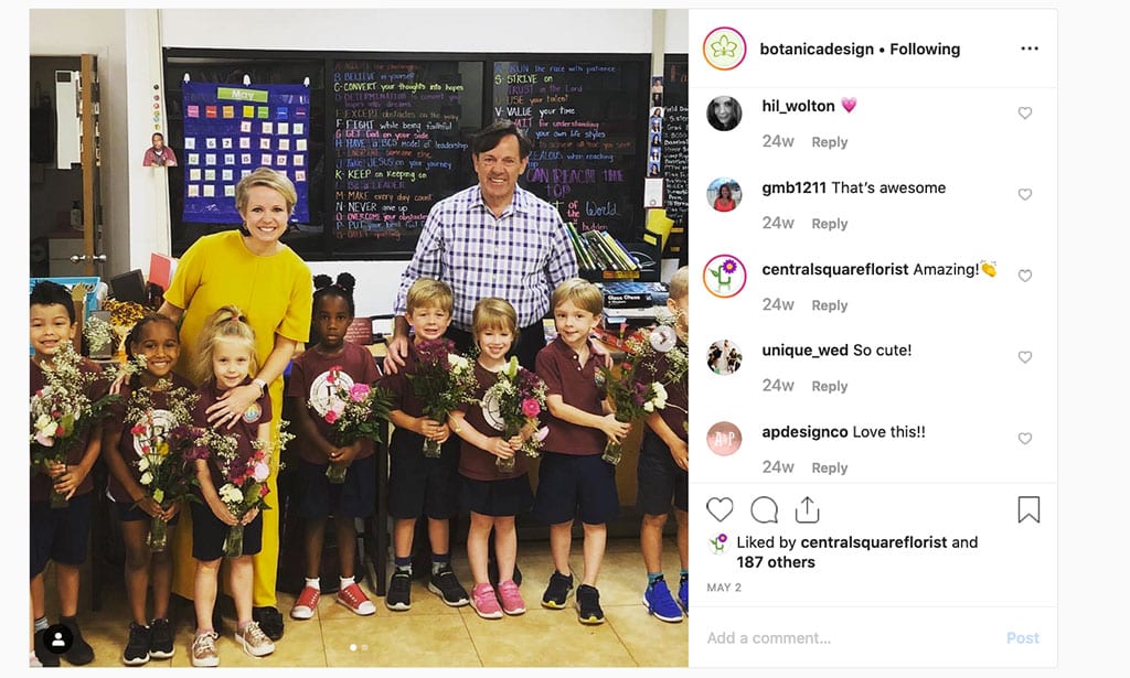 - In Tampa, Florida, Botanica International Design Studio, took the morning to engage young flower lovers, with a visit to a local elementary school (along with an adorable photo shared on Instagram). “In addition to having them create their own designs, taught them about the flowers themselves as well as how flowers create happiness and the perfect reasons to give flowers,” according to the caption.