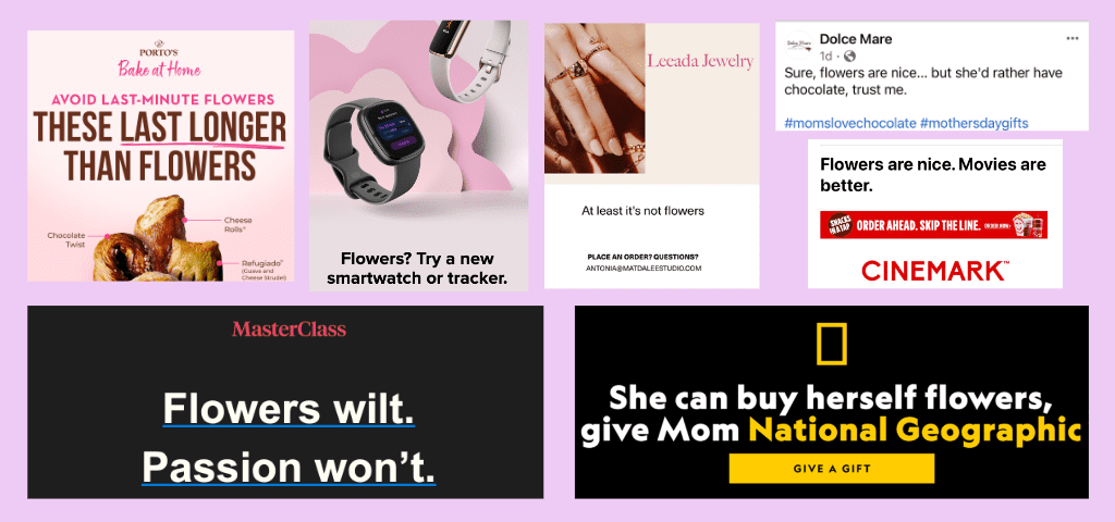 - Matdalee Studio, a Los Angeles-based jewelry wholesaler and brand management company, which promoted Mother’s Day gift offerings with an email that said, “…at least it’s not flowers.”