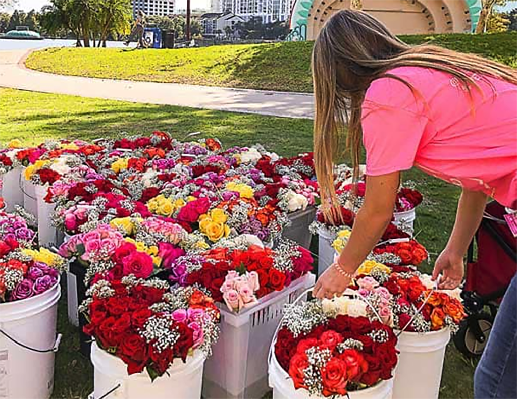 Nine years ago, when Valerie Lee, owner of J. Miller Flowers and Gifts in Oakland, California, was preparing to participate in the first Petal It Forward, she made a last-minute decision to dress her distribution crew in a uniform. She purchased bright orange T-shirts, hand stamped them with “Petal It Forward” and asked everyone to wear black pants. The uniform has become a mainstay in the annual event because it helps avoid confusion during the giveaway, she says.