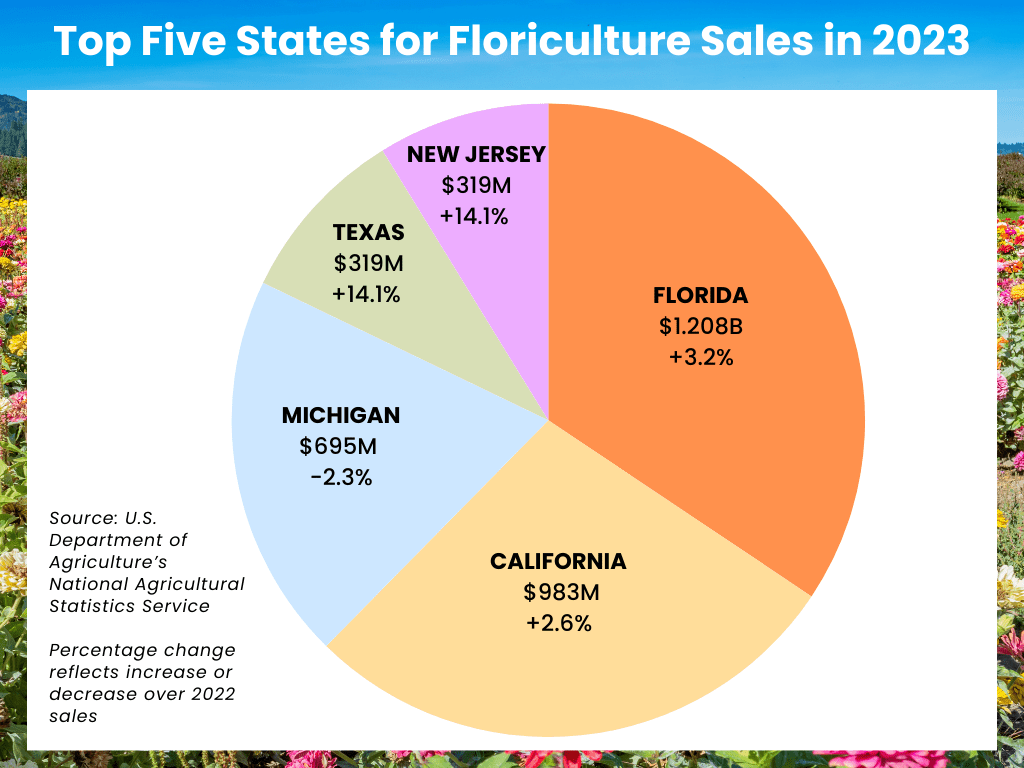 - Florida, California, and Michigan accounted for 43% of total floriculture sales.