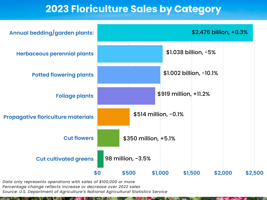 Overall sales of U.S. grown floriculture products were flat last year over 2022, with $6.690 billion in total sales. This follows a 4.2% increase in sales from 2021 to 2022.
