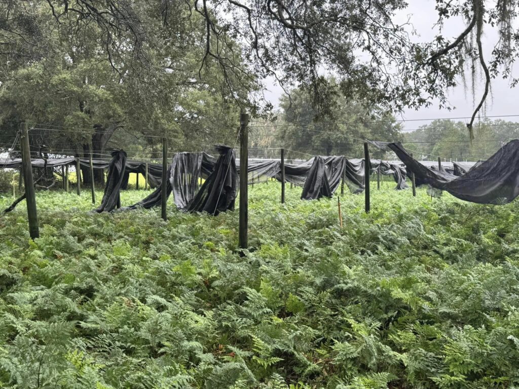At Albin Hagstrom & Son Inc. in Pierson, Florida, rebar is bent to the ground, nearly 40 acres of torn, twisted shade cloth have left crops sun damaged, and floodwater stalled delivery trucks.