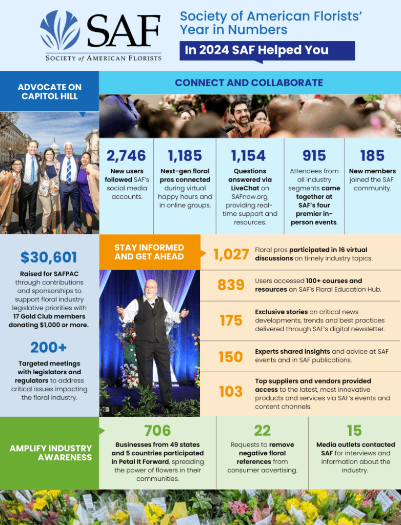 In a year that brought a changing political landscape, two destructive hurricanes, new findings on sustainability, business consolidations and closures, market fluctuations and cooling flower sales (read “2024 Industry Snapshot” for more details), the Society of American Florists helped the floral industry navigate challenges and opportunities through government advocacy, education, expert insights and connections.