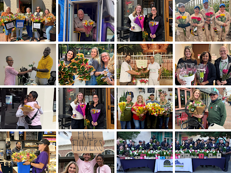 Further up the coast in Charleston, South Carolina, Tiger Lily Florist celebrated with a high-energy giveaway outside the Francis Marion Hotel, across from a busy city park. Owner Lisa Hays Holmes captured the moment in a Facebook reel tagged to fellow SAF members nationwide. “There’s just something so fun about giving away flowers for free,” she wrote, thanking Syndicate Sales and Mayesh Charleston for helping make it happen.