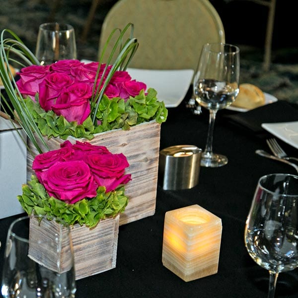 - Small clusters of roses in low containers with a sprinkling of rose petals on the table among votive candles can create a very elegant mood.