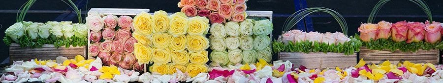 - Pavé rose arrangements (short stems tightly grouped to form a flat, uniform surface of beautiful rose buds)