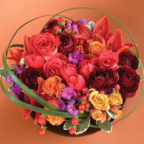 Flowers Featured: This “pavé” arrangement fully blankets the top of a sleek black ceramic bowl. Orbiting lily grass frames rich maroon ranunculus, orange spray roses, two-toned reddish-orange and coral-apricot roses, burnt orange Asiatic lilies, hypericum berries, magenta phlox and variegated pittosporum.