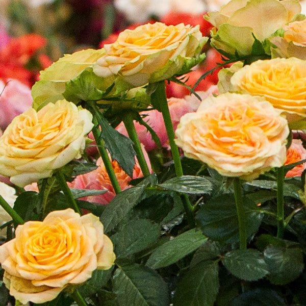 Tea roses open 3 to 4 inches. Stems can be 12 — 30 inches. Spray roses can have several flowers on one stem.
