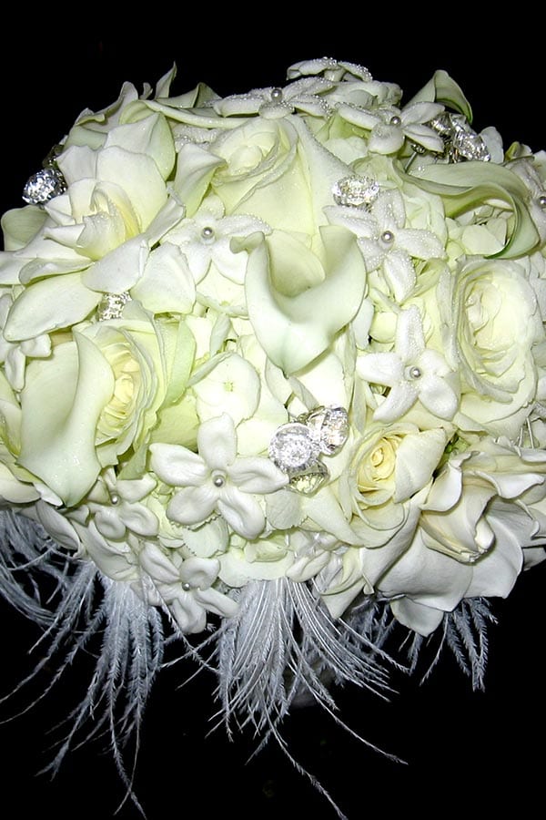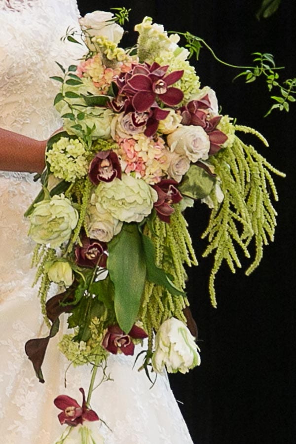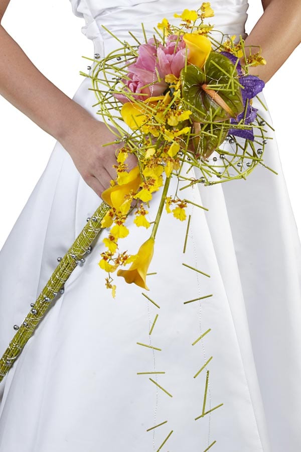 This bouquet features flowers that descend below the main portion of the bouquet design. The voluptuousness of the bouquet is often the main feature of the wedding costume. Cascade bouquets are most often used in formal and traditional weddings.