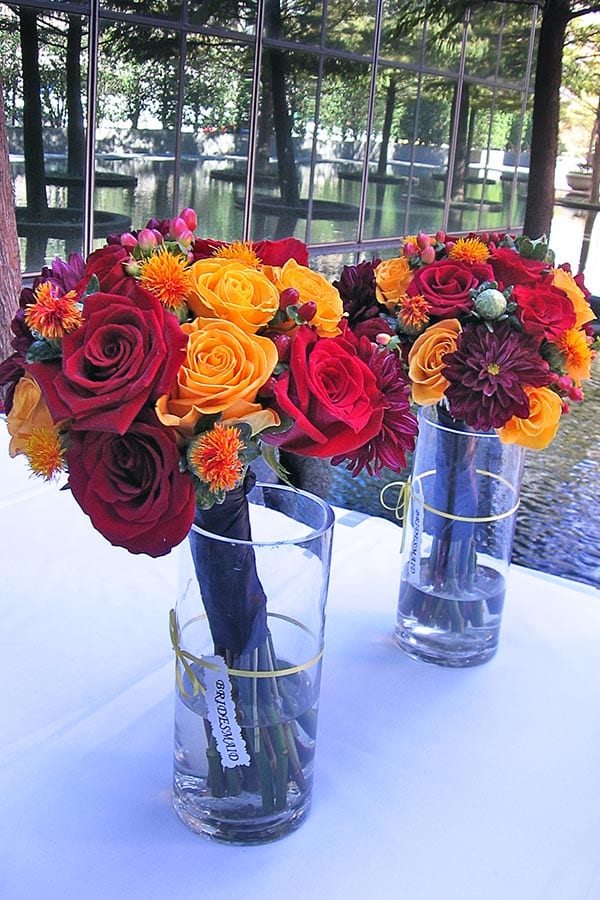 Florists create hand-tied bouquets by placing the stems of the flowers, foliage and accessories in their hand and wrapping them around the center of the design until they are securely fastened. These arrangements are designed to show the natural growth of the stems, which are often wrapped in ribbon or french braided together. Hand-tied bouquets have a more casual air and are particularly nice for garden weddings and brides who like the feeling of an unarranged gathering of flowers.