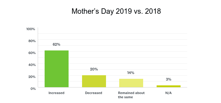 Mother’s Day 2019 proved to be another strong holiday for the floral industry, with 62 percent of retailer respondents to a Society of American Florists post-holiday survey saying sales were higher than their 2018 returns. Among those who saw sales rise, 42 percent said the increase was between 1 percent and 10 percent; another 25 percent saw gains between 11 percent and 20 percent.