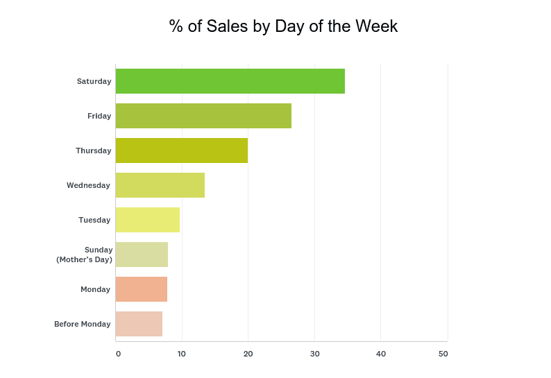 On average respondents said that about 35 percent of their holiday orders arrived on Saturday, just a day before Mother’s Day. That’s a change from last year and 2017, when respondents said they received about 20 percent of orders on Saturday. (Other high-volume days this year included Friday, 27 percent, and Thursday, 20 percent.)