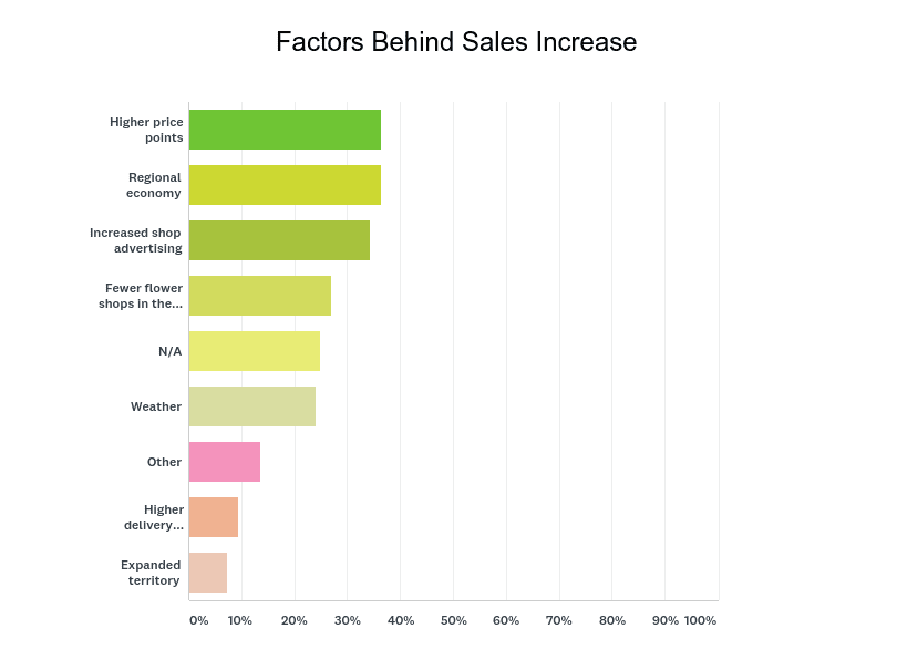 Factors Behind Increases and Decreases. The top three factors credited by florists with increased sales were regional economy (37 percent); higher price points (37 percent); increased shop advertising and promotion (34 percent).