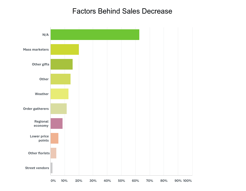The top factors behind sales decreases were competition from mass marketers/supermarkets (20 percent) competition from other gift/non-floral vendors (16 percent) and the weather (13 percent).